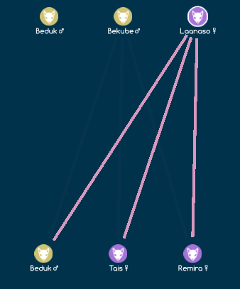 All living creatures and their known parents can be viewed in a family tree. Each icon is color-coded: purple for female, yellow for male, and black for a deceased parent (unless the father was a friendly Bearyena). When a Nicheling dies, it will only continue to be displayed on the family tree if it has living relatives.